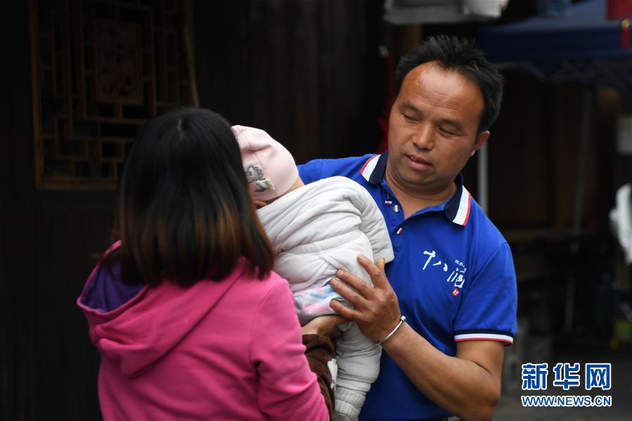 施六金(右)從妻子手中接過兒子施澤恩(4月25日攝)。1973年出生于十八洞村的施六金,由于父親患病很早就放棄學業(yè)和母親扛起了家庭的重擔。為了生活,他還曾遠去東南亞打工。2015年,看到家鄉(xiāng)的變化,施六金回到村里開起了農(nóng)家樂,年度家庭人均純收入也從2014年的1715元增長到了2019年的35696元。2018年,施六金與心愛的人組建了家庭。今年初,施六金與愛人迎來了一個大胖小子?!白鋈俗鍪乱没貓蠛透卸??!笔┝鸾o剛出生的兒子取名施澤恩。新華社記者薛宇舸攝