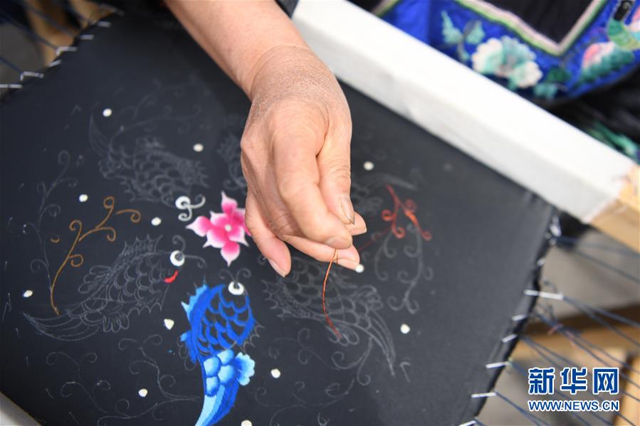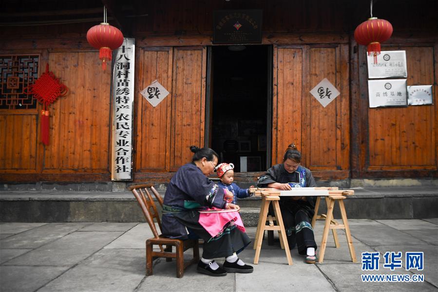 吳美金(右一)在十八洞村苗繡特產(chǎn)農(nóng)民專業(yè)合作社繡苗繡(4月24日攝)。1967年出生的吳美金,1992年嫁入飛蟲村(現(xiàn)十八洞村飛蟲寨)時,只有爛泥路的飛蟲村不僅田土少,掙錢活路也少,生活十分困難。2014年,吳美金加入了十八洞村苗繡特產(chǎn)農(nóng)民專業(yè)合作社,從小就會的苗繡傳統(tǒng)手藝如今成了家庭增收的法寶,不僅在家門口就把錢掙了,同時還能照顧年幼的孫子孫女?!艾F(xiàn)在的日子,比年輕的時候好多了?!眳敲澜鹫f。新華社記者薛宇舸攝