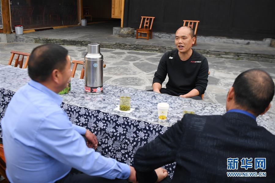 楊正邦(中)在和來自浙江的住客攀談(4月25日攝)。楊正邦1978年出生于十八洞村,在外打工多年。近些年,眼看來十八洞村的游客越來越多,村里越來越熱鬧,楊正邦在2017年結束自己的打工生涯回鄉(xiāng)發(fā)展。他先是在村里擺起小吃攤,2018年開起農(nóng)家樂,去年又搭起新房子擴建成民宿,年度家庭人均純收入從2014年的1923元增加到2019年的7173元。新華社記者薛宇舸攝