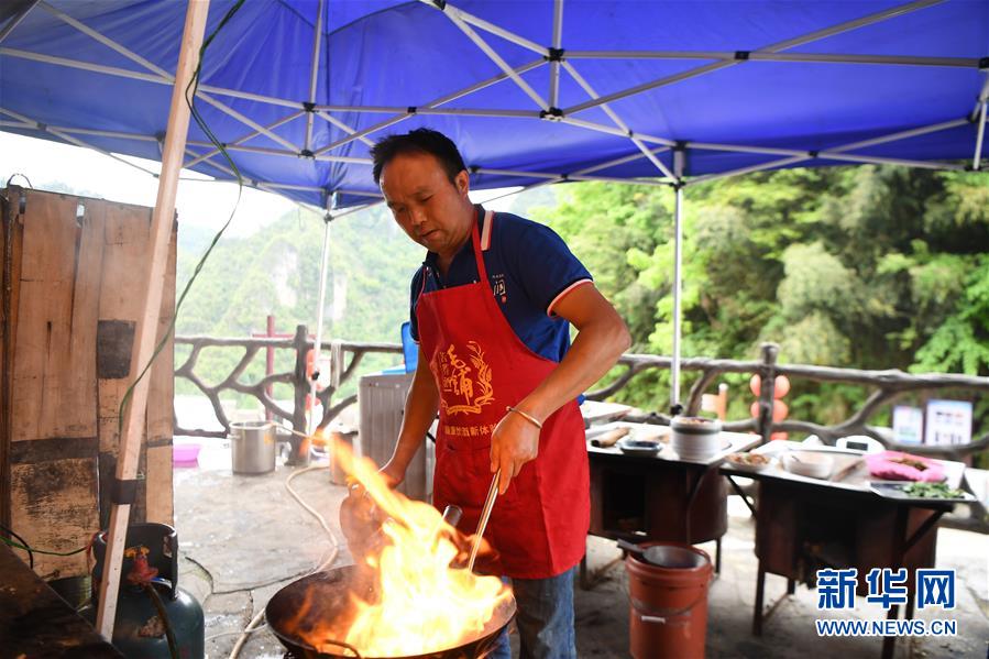 施六金在自家開的農(nóng)家樂為客人準備午餐(4月25日攝)。1973年出生于十八洞村的施六金,由于父親患病很早就放棄學業(yè)和母親扛起了家庭的重擔。為了生活,他還曾遠去東南亞打工。2015年,看到家鄉(xiāng)的變化,施六金回到村里開起了農(nóng)家樂,年度家庭人均純收入也從2014年的1715元增長到了2019年的35696元。2018年,施六金與心愛的人組建了家庭。今年初,施六金與愛人迎來了一個大胖小子?!白鋈俗鍪乱没貓蠛透卸?。”施六金給剛出生的兒子取名施澤恩。新華社記者薛宇舸攝