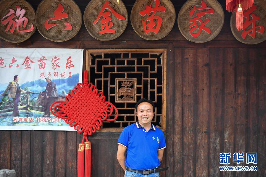 這是施六金在他的農(nóng)家樂前留影(4月25日攝)。1973年出生于十八洞村的施六金,由于父親患病很早就放棄學業(yè)和母親扛起了家庭的重擔。為了生活,他還曾遠去東南亞打工。2015年,看到家鄉(xiāng)的變化,施六金回到村里開起了農(nóng)家樂,年度家庭人均純收入也從2014年的1715元增長到了2019年的35696元。2018年,施六金與心愛的人組建了家庭。今年初,施六金與愛人迎來了一個大胖小子。“做人做事要懂得回報和感恩?!笔┝鸾o剛出生的兒子取名施澤恩。新華社記者薛宇舸攝