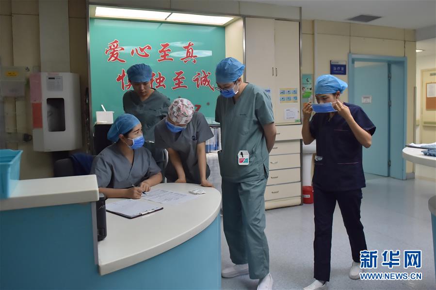 5月11日,在北京地壇醫(yī)院感染二科護(hù)士站,白班護(hù)士高齊(右)與晚班護(hù)士劉印懷交接工作。北京地壇醫(yī)院是北京市收治新冠肺炎患者的定點(diǎn)醫(yī)院之一,醫(yī)院的醫(yī)護(hù)人員一直奮戰(zhàn)在抗擊疫情的一線。在國際護(hù)士節(jié)前夕,記者前往北京地壇醫(yī)院,記錄下抗疫一線護(hù)士的日常工作狀態(tài)。新華社記者彭子洋攝