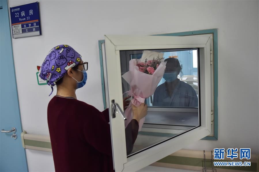 5月11日,在北京地壇醫(yī)院感染二科病房外,一名護士向病人轉交病人女兒送來的鮮花。北京地壇醫(yī)院是北京市收治新冠肺炎患者的定點醫(yī)院之一,醫(yī)院的醫(yī)護人員一直奮戰(zhàn)在抗擊疫情的一線。在國際護士節(jié)前夕,記者前往北京地壇醫(yī)院,記錄下抗疫一線護士的日常工作狀態(tài)。新華社記者彭子洋攝