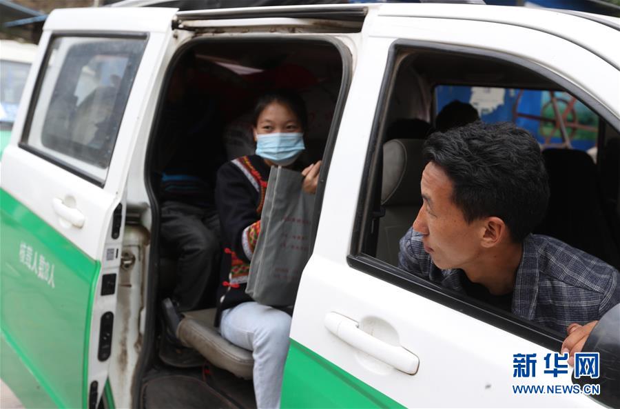 5月12日,在四川省昭覺縣阿土列爾村,莫色雄體(右)坐上車準(zhǔn)備前往昭覺縣易地扶貧搬遷縣城集中安置點(diǎn)的新家。新華社記者江宏景攝