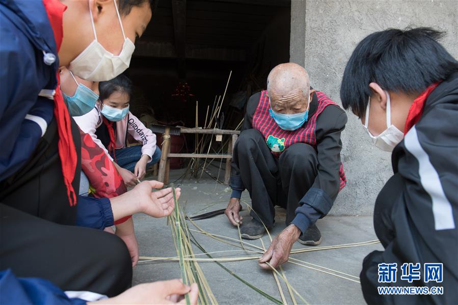 5月12日,浙江諸暨龍溪村的百歲老人蔡渭東在家中為小學(xué)生講解篾器編法。浙江諸暨東和鄉(xiāng)龍溪村有一位102歲的老人蔡渭東,他從12歲開始拜師學(xué)藝,做了90年的篾匠,如今依然耳聰目明,每天堅(jiān)持編織篾器。蔡渭東老人說他舍不得丟掉這份老手藝,也希望年輕人能傳承下去。新華社記者翁忻旸攝