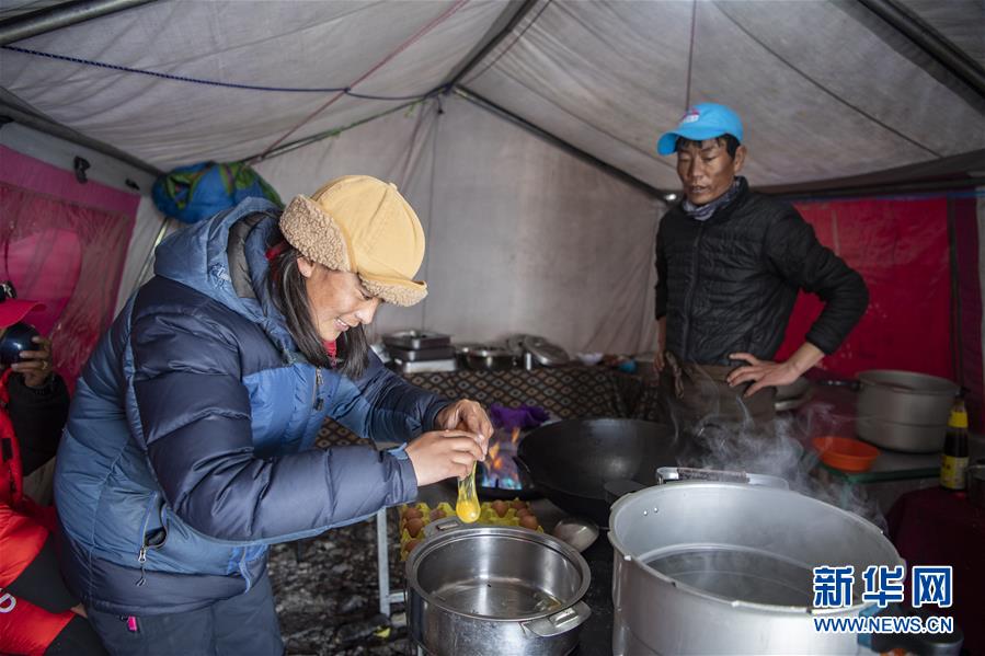 在海拔6500米的前進營地,高山廚師在準(zhǔn)備菜品(5月10日攝)。新華社記者孫非攝