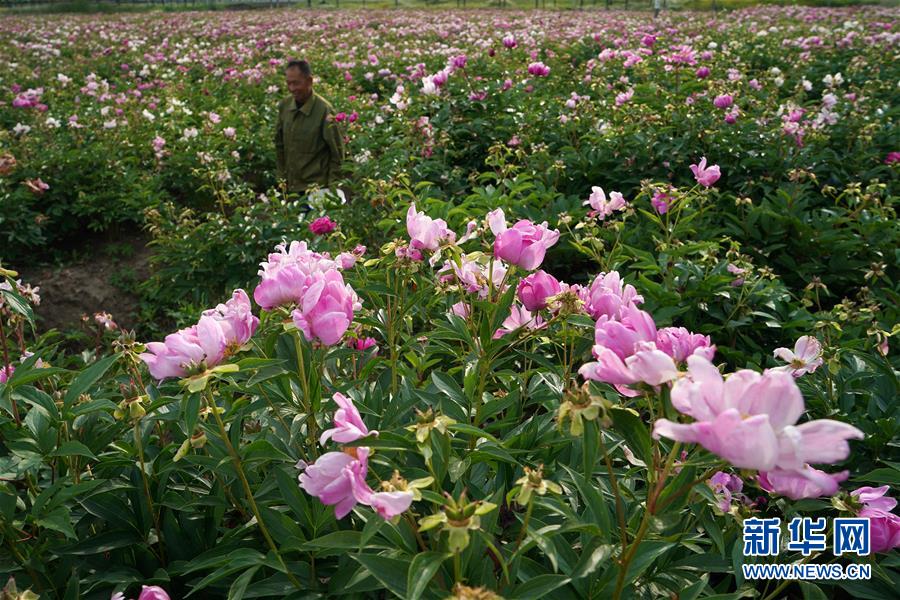 工作人員在金湖縣金燦芍藥園里進(jìn)行農(nóng)業(yè)管理(5月11日攝)。新華社記者韓瑜慶攝