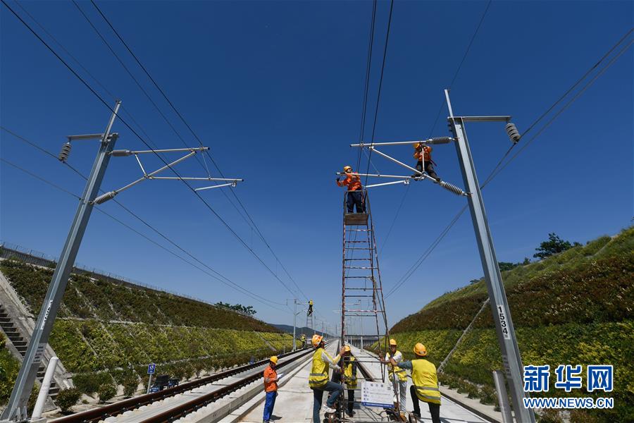 5月12日,中國鐵路上海局集團公司上海高鐵維修段的技術人員在商合杭高鐵浙江湖州段調整接觸網。近日,商合杭高鐵合肥至湖州段聯調聯試正有條不紊進行中。中國鐵路上海局集團公司上海高鐵維修段抽調49名精兵強將,持續(xù)對管轄范圍內的高鐵線路、信號、接觸網線進行調試,為下一階段打下基礎。據了解,商合杭高鐵合湖段聯調聯試之后將轉入運行試驗階段,驗收合格并通過安全評估后,力爭6月底具備開通運營條件。新華社記者黃宗治攝