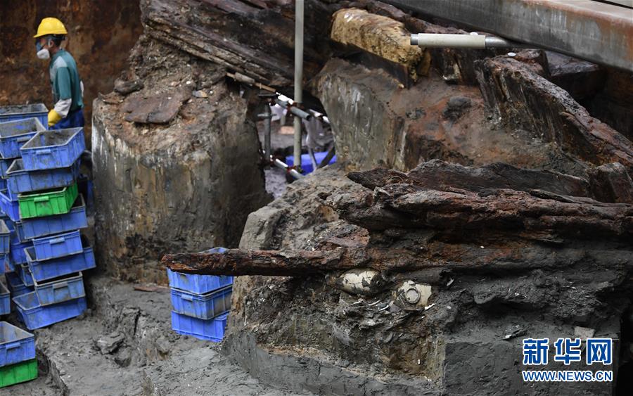 這是位于廣東陽(yáng)江海陵島的“南海I號(hào)”已清理出的船艉部分(5月12日攝)。新華社記者鄧華攝