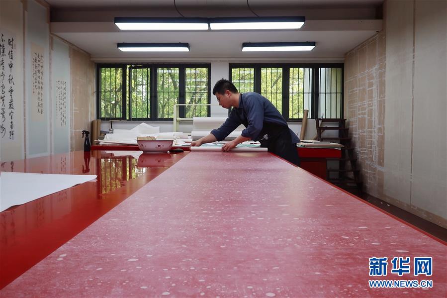 5月13日,古籍修復(fù)師在對書畫作品進行裝裱操作。天一閣藏品修復(fù)部目前有修復(fù)師14人,每年約修復(fù)古籍14000余頁。據(jù)介紹,修復(fù)一冊古籍通常需要1至2個月,有的甚至需要1年以上。新華社記者鄭夢雨攝