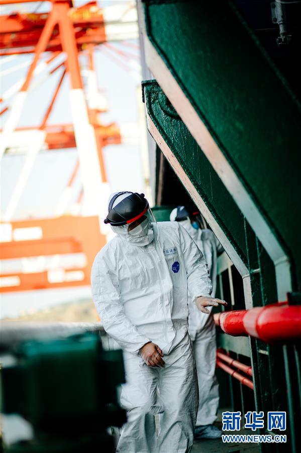 5月13日,山東威海出入境邊防檢查站民警登上國際集裝箱貨輪檢查。新華社記者朱崢攝
