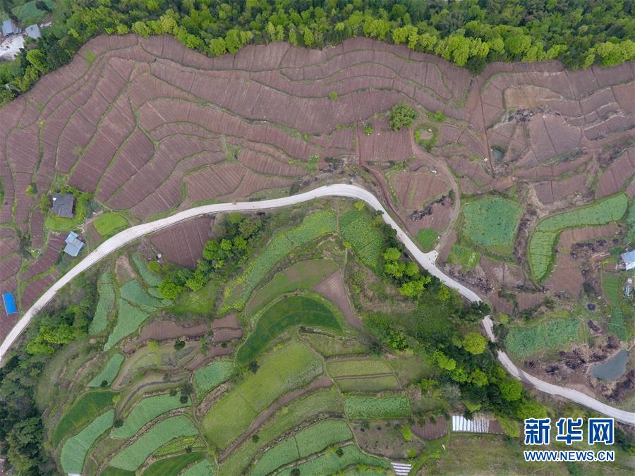 這是4月1日拍攝的龍臺(tái)村部分土地(無(wú)人機(jī)照片)。圖中上半部分為已種上中藥材的新整土地,下半部分為該村種植的傳統(tǒng)作物。新華社記者劉坤攝
