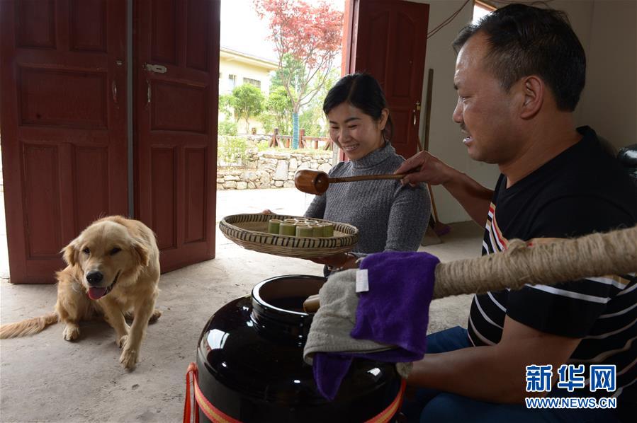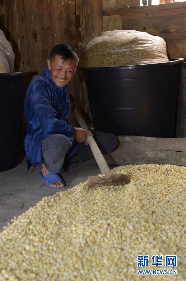 5月14日,在貴州省畢節(jié)市百里杜鵑管理區(qū)黃泥鄉(xiāng)龍?zhí)链逡患揖谱鞣唬迕駥?duì)玉米進(jìn)行發(fā)酵。貴州省畢節(jié)市百里杜鵑管理區(qū)黃泥鄉(xiāng)龍?zhí)链宓凝執(zhí)凉啪疲颡?dú)特的古法釀酒技術(shù),口感獨(dú)特而遠(yuǎn)近聞名。全村有釀酒戶142戶,年產(chǎn)量達(dá)45萬(wàn)多公斤,龍?zhí)凉啪七h(yuǎn)銷重慶、廣東、浙江等地,龍?zhí)凉啪埔殉蔀辇執(zhí)寥嗽鍪盏闹匾獊?lái)源。新華社記者楊楹攝