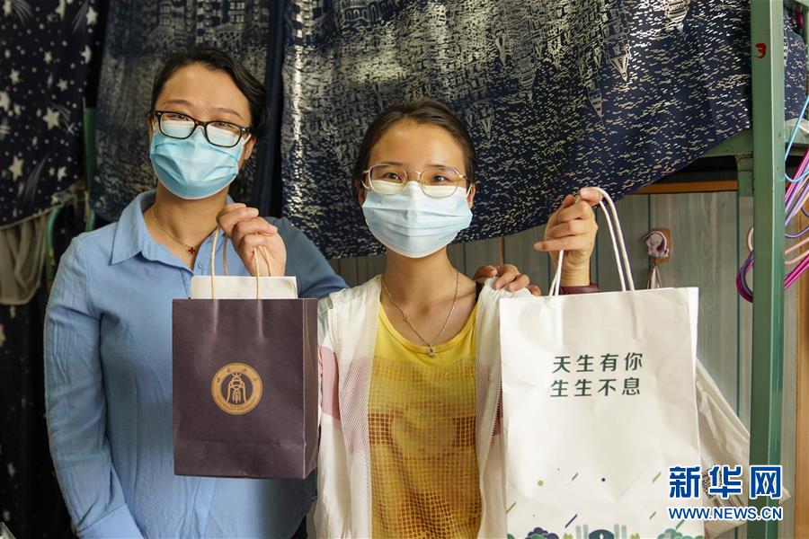 5月15日,在西南大學(xué)女生宿舍內(nèi),一名學(xué)生(右)展示學(xué)校和學(xué)院送來的裝有口罩、防疫指南的紙袋。當日,重慶西南大學(xué)迎來疫情以來首批返校大學(xué)生。據(jù)介紹,按照疫情防控的需要,重慶市高校2020年春季學(xué)期從5月11日起按照“一校一策”原則,實行錯峰錯時分批次有序開學(xué)復(fù)課。新華社記者劉潺攝