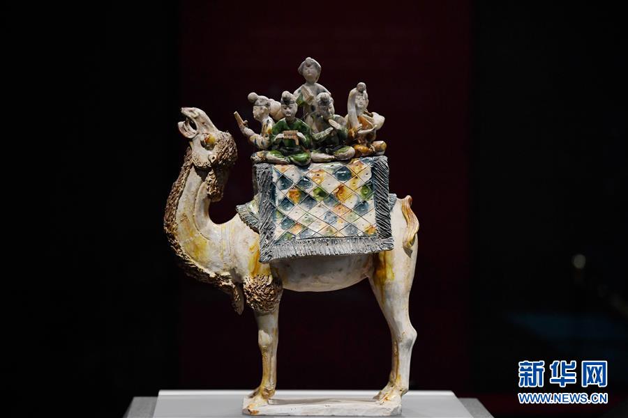 這是在陜西歷史博物館展出的唐三彩駱駝?shì)d樂(lè)俑(3月25日攝)。新華社記者 李一博 攝