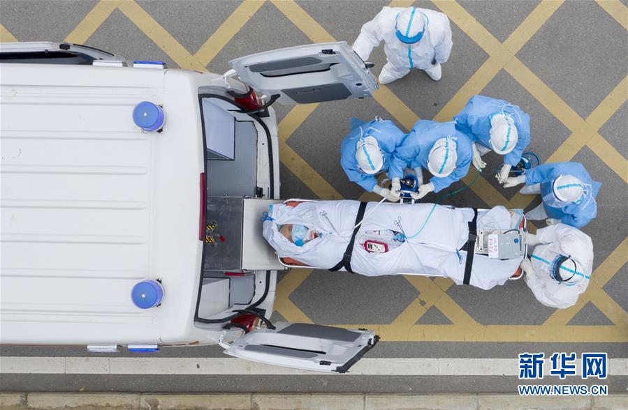 在華中科技大學(xué)附屬同濟醫(yī)院中法新城院區(qū),醫(yī)護人員護送一名剛做完CT檢查的新冠肺炎重癥患者上負壓救護車(3月6日攝,無人機照片)。新華社記者才揚攝