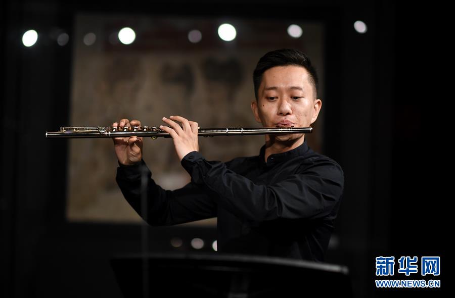 在陜西歷史博物館唐代壁畫珍品館,西安交響樂團(tuán)長笛首席孫丁為“云上國寶”音樂會彩排(5月14日攝)。為迎接國際博物館日,5月14日,西安交響樂團(tuán)走進(jìn)陜西歷史博物館唐代壁畫珍品館,為5月18日的“云上國寶”音樂會彩排。觀眾將通過網(wǎng)絡(luò)直播,在聆聽天籟的同時欣賞國之瑰寶,感受藝術(shù)與美的和諧共鳴。新華社記者李一博攝