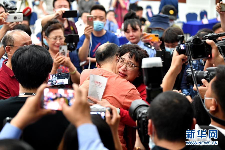 5月18日,李靜芝、毛振平(左)與失散32年的兒子毛寅擁抱。新華社記者張博文攝