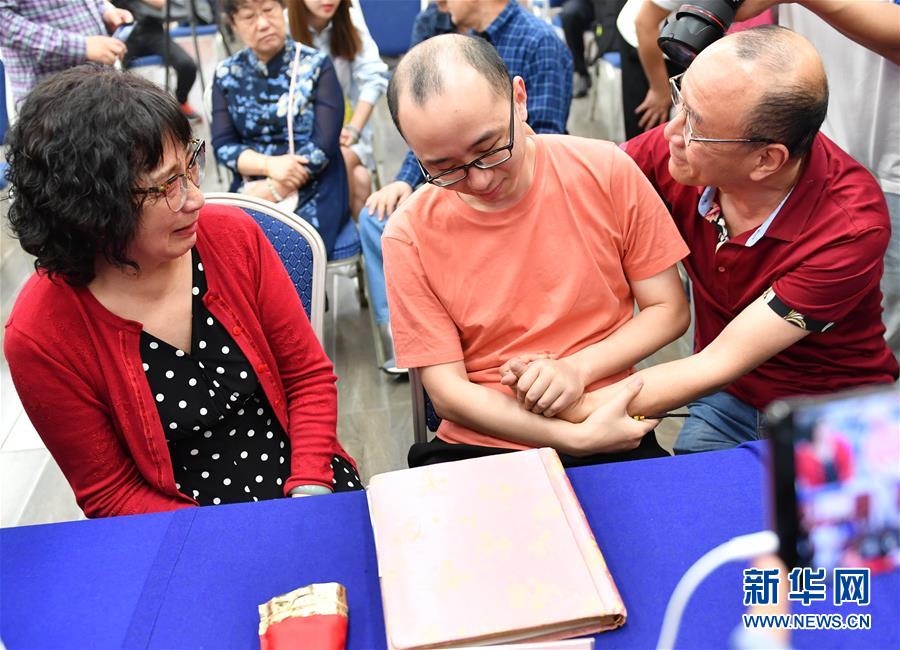 5月18日,李靜芝、毛振平(左)與失散32年的兒子毛寅團聚。新華社記者張博文攝