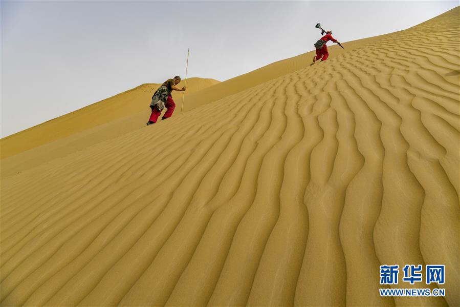 在新疆尉犁至且末沙漠公路施工現(xiàn)場(chǎng),測(cè)繪員劉耀軍(前)和助手甘才云翻越一處高約40米的沙丘(5月17日攝)。新華社記者胡虎虎攝