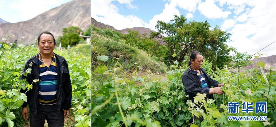 拼版照片:左圖為西藏昌都市芒康縣木許鄉(xiāng)阿東村村民楊培;右圖為楊培在葡萄園里忙碌。近年來,芒康縣大力發(fā)展葡萄種植,成為群眾脫貧增收的“甜蜜”產(chǎn)業(yè)。楊培在村里種了3.5畝葡萄,2019年出售葡萄賺了8000多元。以前,楊培只種青稞和玉米,除了自給自足,幾乎沒有經(jīng)濟(jì)收益(5月6日攝)。新華社記者詹彥攝
