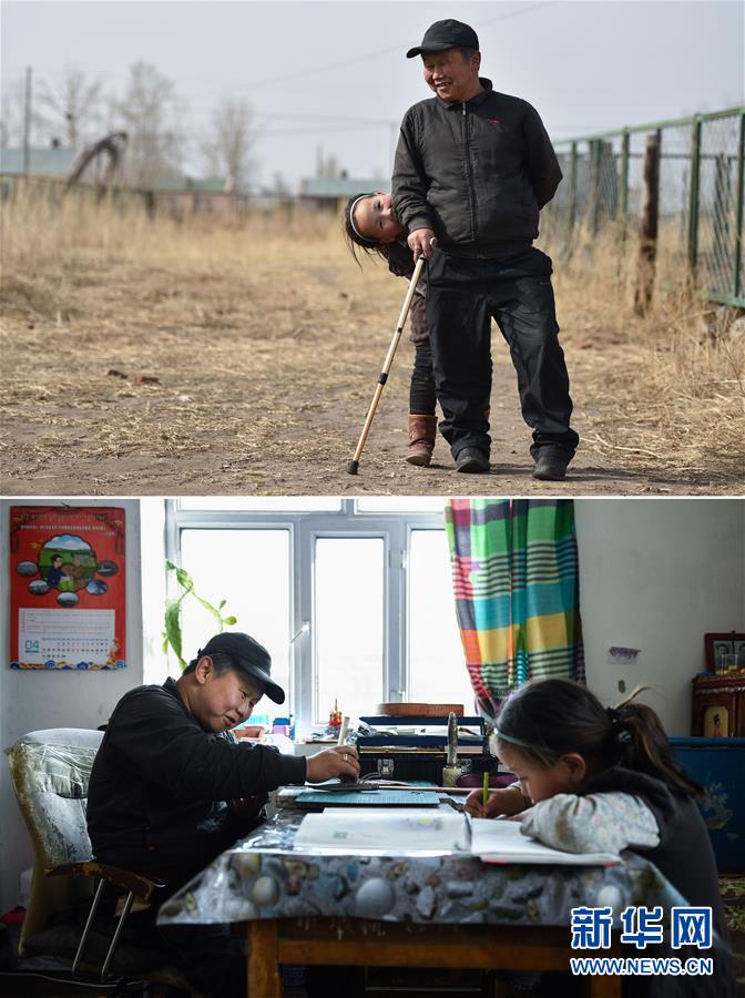 拼版照片上圖:在錫尼河鎮(zhèn)的出租房外,米格木爾(前)和女兒南吉樂(lè)瑪一起玩耍;下圖:在錫尼河鎮(zhèn)的出租房?jī)?nèi),米格木爾在進(jìn)行皮雕,女兒南吉樂(lè)瑪在溫習(xí)功課(照片均攝于4月15日)。2016年,家住內(nèi)蒙古鄂溫克族自治旗錫尼河鎮(zhèn)孟根礎(chǔ)魯嘎查的米格木爾因?yàn)槿笔趧?dòng)能力成了建檔立卡貧困戶。獨(dú)自撫養(yǎng)女兒的他為了女兒上學(xué)離開了牧區(qū)來(lái)到鎮(zhèn)上租房陪讀,生活的壓力讓米格木爾犯了難。2018年春天,他通過(guò)當(dāng)?shù)孛褡逦幕a(chǎn)業(yè)創(chuàng)業(yè)園舉辦的皮雕手藝培訓(xùn),讓他居家賺錢、陪讀兩不誤,逐步實(shí)現(xiàn)穩(wěn)定脫貧。2020年4月,我國(guó)第一個(gè)成立的少數(shù)民族自治區(qū)——內(nèi)蒙古自治區(qū)宣告全面脫貧“摘帽”。黨的十八大以來(lái),我們堅(jiān)持以人民為中心的發(fā)展思想,明確了到2020年我國(guó)現(xiàn)行標(biāo)準(zhǔn)下農(nóng)村貧困人口實(shí)現(xiàn)脫貧、貧困縣全部摘帽、解決區(qū)域性整體貧困的目標(biāo)任務(wù)。目前看,脫貧進(jìn)度符合預(yù)期,成就舉世矚目。這些成績(jī)的取得,凝聚了全黨全國(guó)各族人民智慧和心血,是廣大干部群眾扎扎實(shí)實(shí)干出來(lái)的。脫貧摘帽不是終點(diǎn),而是新生活、新奮斗的起點(diǎn)。新華社記者劉磊攝