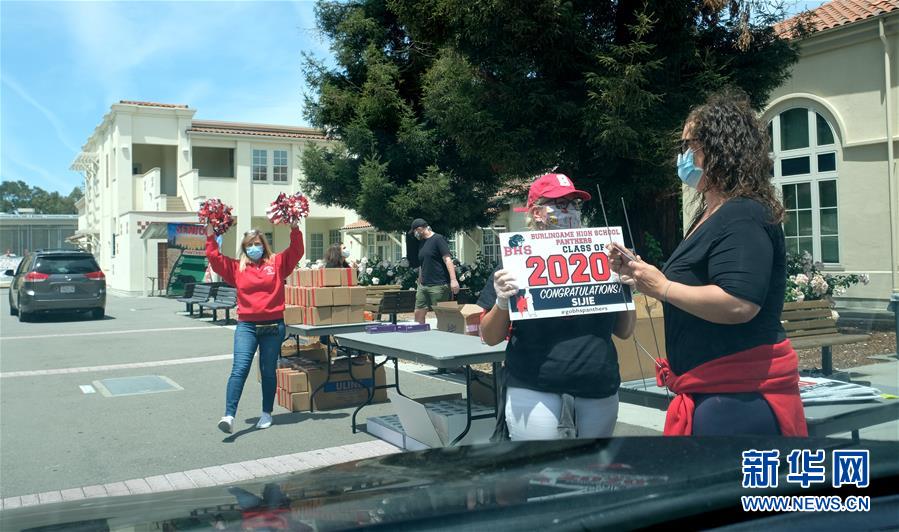 5月22日,在美國加州北部圣馬特奧縣,人們歡迎來辦理畢業(yè)手續(xù)的學生。新華社記者吳曉凌攝