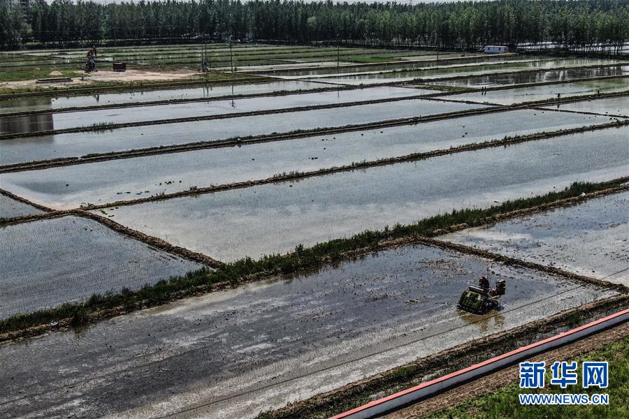 5月24日,盤錦市大洼區(qū)的農(nóng)民在駕駛插秧機插秧(無人機照片)。新華社記者潘昱龍攝