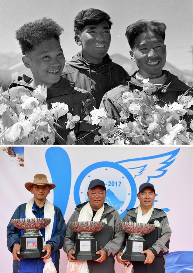 拼版照片:上圖為1960年6月7日,人類歷史上首次從北坡登頂珠峰的中國登山隊(duì)隊(duì)員王富洲(右)、貢布(中)與屈銀華三人凱旋拉薩后捧花合影(資料照片)。新華社發(fā)下圖為2017年7月12日,在紀(jì)念西藏登山隊(duì)成功登頂世界14座海拔8000米以上高峰10周年儀式上,隊(duì)員次仁多吉(中)、邊巴扎西(左)和洛則獲頒紀(jì)念獎(jiǎng)杯。新華社記者普布扎西攝