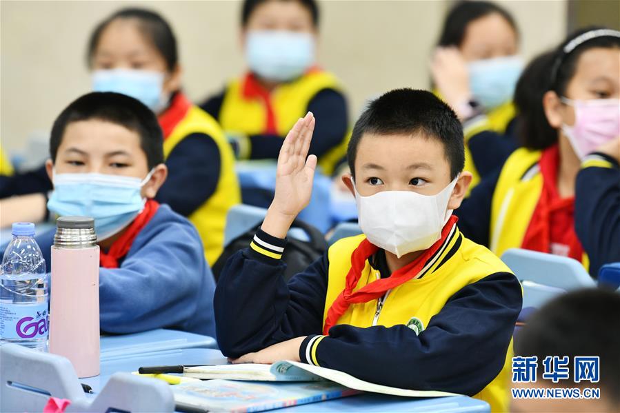 5月25日,貴陽市南明區(qū)苗苗實驗學(xué)校的學(xué)生在課堂上舉手回答問題。新華社記者楊文斌攝