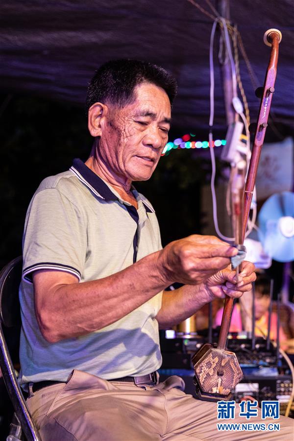 5月24日,海南臨高新風(fēng)人偶戲團(tuán)成員在演出前調(diào)試樂(lè)器。新華社記者張麗蕓攝