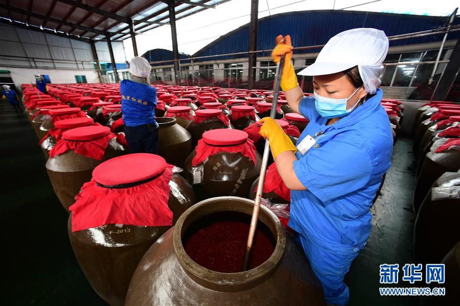 5月26日,工人在貴州省黔東南苗族侗族自治州麻江縣明洋食品公司生產(chǎn)車(chē)間攪拌釀造過(guò)程中的酸湯原料。