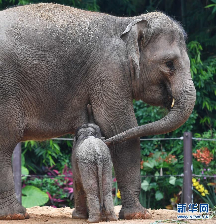 5月27日,廣州長隆的新生亞洲象寶寶在吃奶。在不到一個月的時間內(nèi),廣州長隆野生動物世界的亞洲象家族迎來兩名新丁。4月30日,亞洲象莉娜產(chǎn)下一頭公象,出生時體重88公斤;5月12日,亞洲象伊拉產(chǎn)下一頭母象,出生體重達(dá)108公斤。大象媽媽莉娜和伊拉均為長隆野生動物世界亞洲象種群繁育基地繁殖的亞洲象。至此,長隆亞洲象家族已繁衍至第三代,現(xiàn)共有27頭大象。新華社記者劉大偉攝