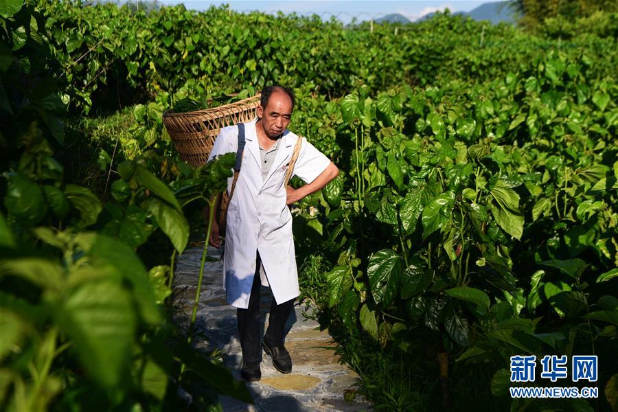5月29日,奉節(jié)縣新民鎮(zhèn)中嶺村蠶桑產(chǎn)業(yè)扶貧基地工作人員在背運(yùn)桑葉。新華社記者 王全超 攝