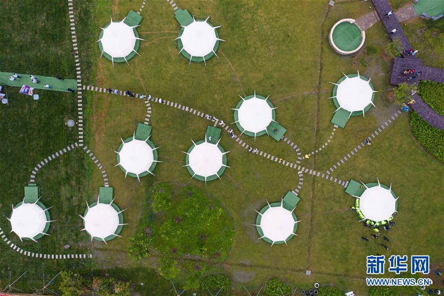 5月31日,空中俯瞰石淙花海內(nèi)的帳篷露營區(qū)(無人機(jī)照片)。新華社記者徐昱攝