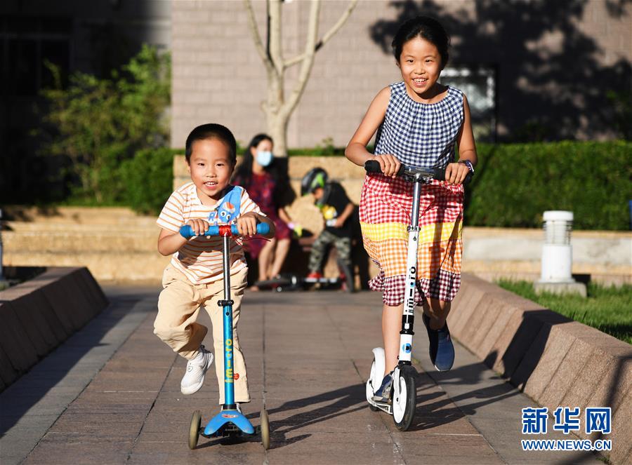 5月31日,在北京市海淀區(qū)中關(guān)村街道新科祥園社區(qū)廣場,小朋友在玩耍。新華社記者任超攝