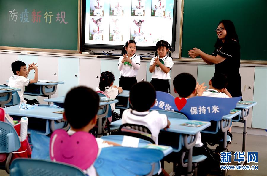 6月2日,上海閔行區(qū)鑫都小學(xué),老師指導(dǎo)一年級小學(xué)生如何正確洗手。當(dāng)日,上海小學(xué)一、二、三年級學(xué)生返校開學(xué)。新華社記者張建松攝。