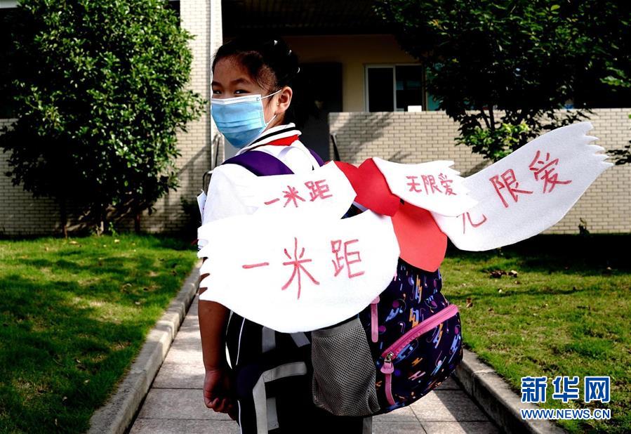 6月2日,上海閔行區(qū)鑫都小學,一名小學生戴著“一米翅膀”走在校園里。當日,上海小學一、二、三年級學生返校開學。新華社記者張建松攝