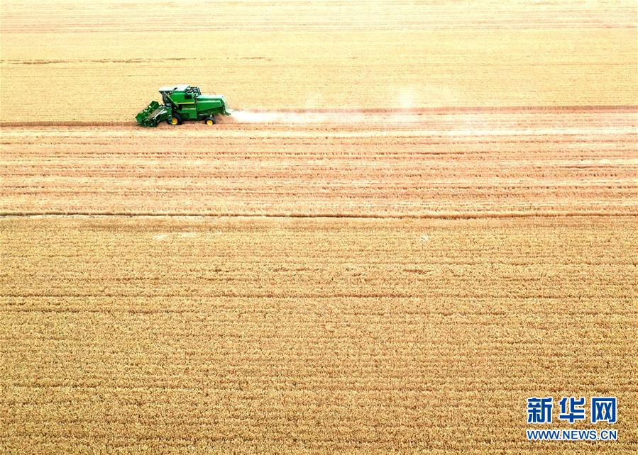 6月2日,在河南省黃泛區(qū)農(nóng)場九分場的麥田里,農(nóng)民操作大型收割機收獲小麥(無人機照片)。新華社記者李嘉南攝。