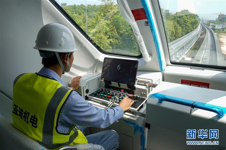 6月3日,工程技術(shù)人員在“云巴”車廂內(nèi)對自動駕駛系統(tǒng)進行調(diào)試。近日,重慶市首條“云巴”示范線項目在重慶璧山區(qū)正式亮相。此次發(fā)布的“云巴”采用電能驅(qū)動,具有轉(zhuǎn)彎半徑小、爬坡能力強、噪音低、安全性高、建設(shè)成本低、建造周期短等優(yōu)勢,能為乘客提供更智能、舒適、便捷的出行體驗。據(jù)介紹,璧山區(qū)“云巴”示范線項目自2019年8月開建,線路正線全長15.4km,共設(shè)車站15座,預(yù)計2020年9月全線通車。新華社記者劉潺攝。