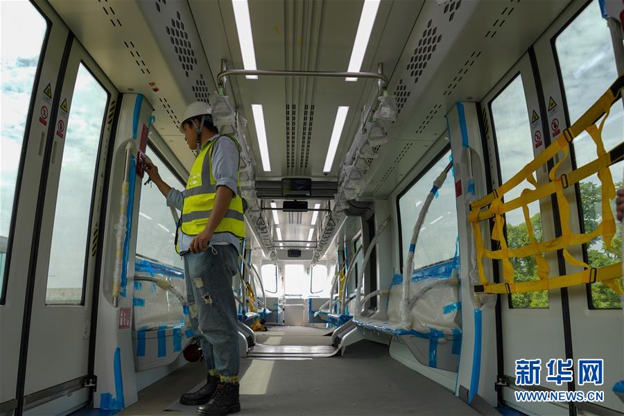 6月3日,工程技術(shù)人員在“云巴”車廂內(nèi)對安裝的電氣設(shè)備進(jìn)行調(diào)試。近日,重慶市首條“云巴”示范線項目在重慶璧山區(qū)正式亮相。此次發(fā)布的“云巴”采用電能驅(qū)動,具有轉(zhuǎn)彎半徑小、爬坡能力強、噪音低、安全性高、建設(shè)成本低、建造周期短等優(yōu)勢,能為乘客提供更智能、舒適、便捷的出行體驗。據(jù)介紹,璧山區(qū)“云巴”示范線項目自2019年8月開建,線路正線全長15.4km,共設(shè)車站15座,預(yù)計2020年9月全線通車。新華社記者劉潺攝。