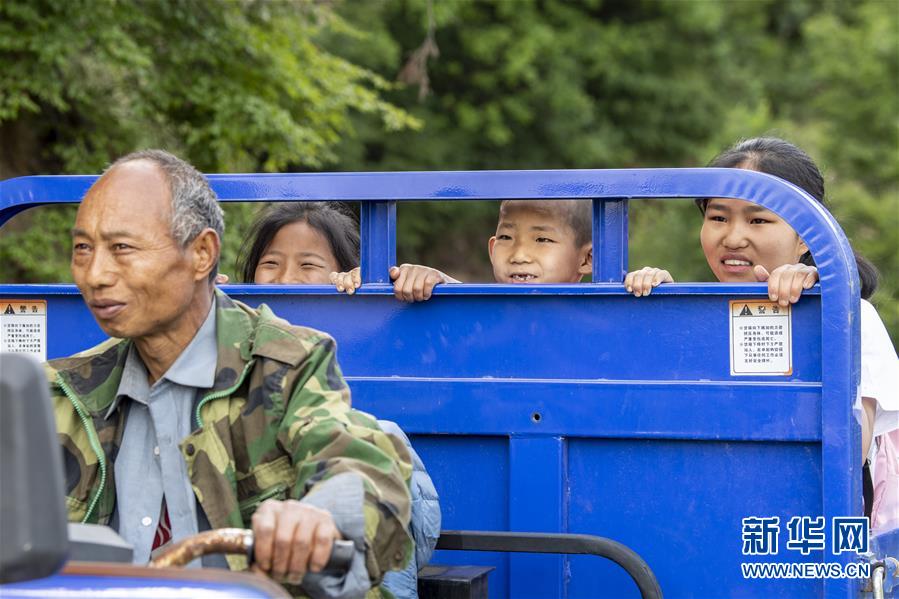 在南背村,秦春蘭(右二)、秦秋蘭(右三)和秦興旺(左三)和老師們走在回家的山路上(5月31日攝)。新華社記者楊晨光攝。
