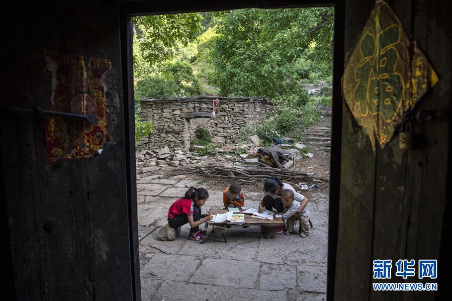 馬武寨寄宿制小學(xué)語(yǔ)文老師崔連瑞(左二)和校長(zhǎng)趙金成在南背村三姐弟的家里為孩子們輔導(dǎo)功課(5月31日攝)。新華社記者楊晨光攝。