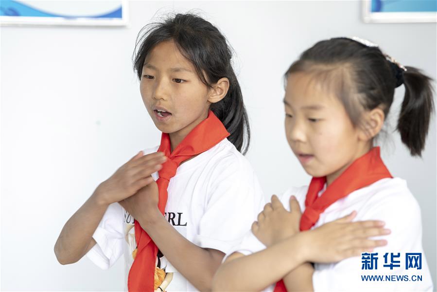 6月2日,在開(kāi)學(xué)第一課上,秦秋蘭(左)在做練習(xí)手語(yǔ)操。新華社記者楊晨光攝。