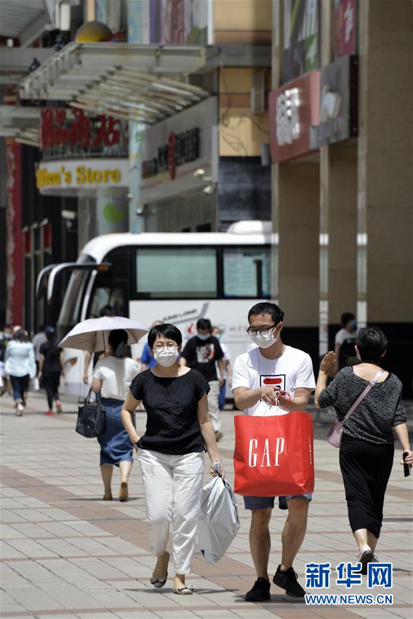 6月3日,市民及游客在王府井步行街購物。近日,游人和市民紛紛來到北京市的王府井、西單、前門大街等著名商業(yè)街購物休閑,這些老商業(yè)街開始逐步恢復昔日的繁華。新華社記者李欣攝。