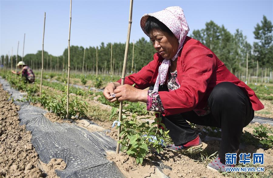 6月3日,村民在深州市魏家橋鎮(zhèn)金銀花種植扶貧基地管理金銀花樹(shù)。今年以來(lái),河北省深州市圍繞決勝全面小康、決戰(zhàn)脫貧攻堅(jiān)任務(wù)目標(biāo),在推進(jìn)產(chǎn)業(yè)扶貧的過(guò)程中注重激發(fā)內(nèi)生動(dòng)力,通過(guò)電商扶貧、扶貧車間、特色種植養(yǎng)殖等多種形式,提升自我“造血”功能,提高貧困群眾受益度。新華社記者李曉果攝。
