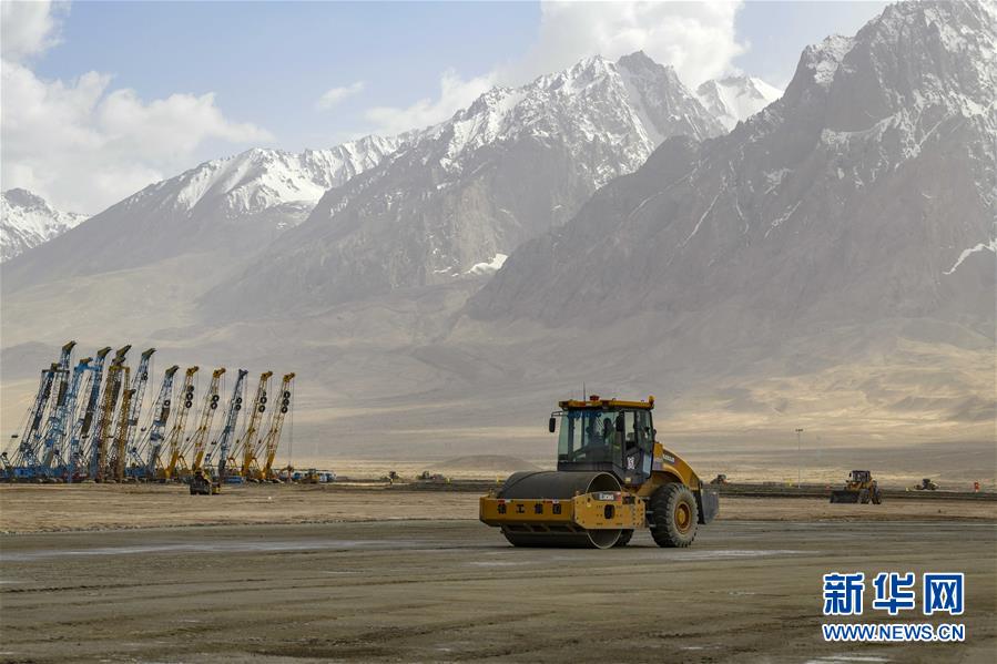 壓路機在新疆塔什庫爾干機場施工現(xiàn)場進行平整作業(yè)(6月3日攝)。新華社記者胡虎虎攝。