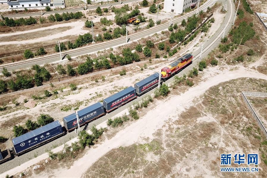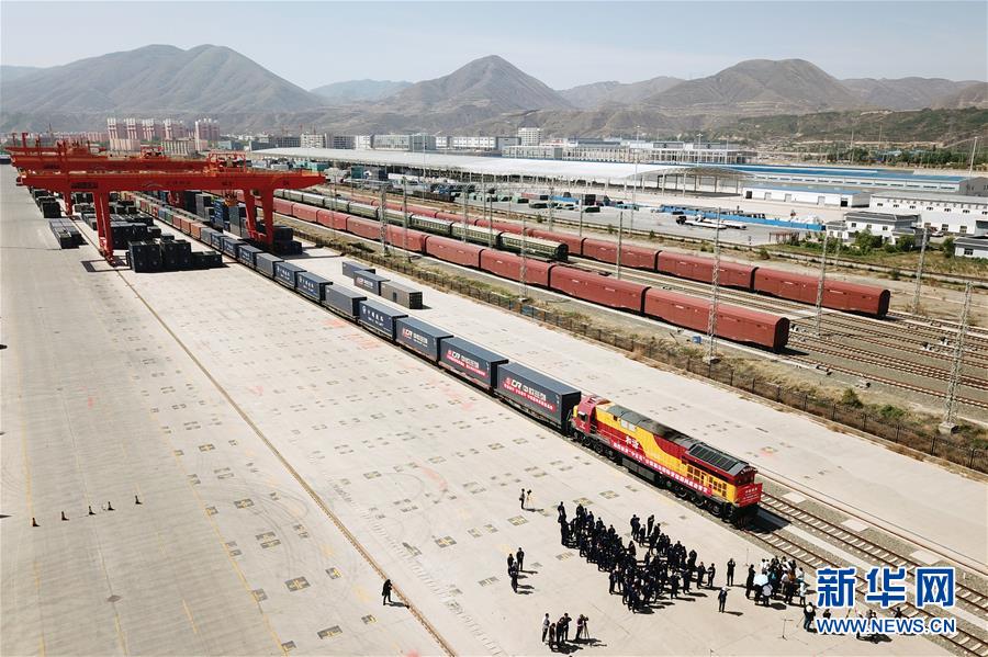 6月5日,在甘肅蘭州國(guó)際陸港,“中吉烏”公鐵聯(lián)運(yùn)國(guó)際貨運(yùn)班列發(fā)車(無人機(jī)照片)。新華社記者范培珅攝。