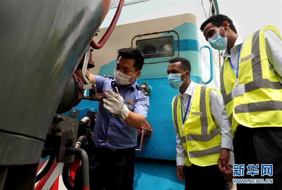 6月5日,帶教司機在教伊迪內(nèi)卡邱(中)和特瑞薩(右)進行機車檢查作業(yè)。 新華社記者 李安 攝