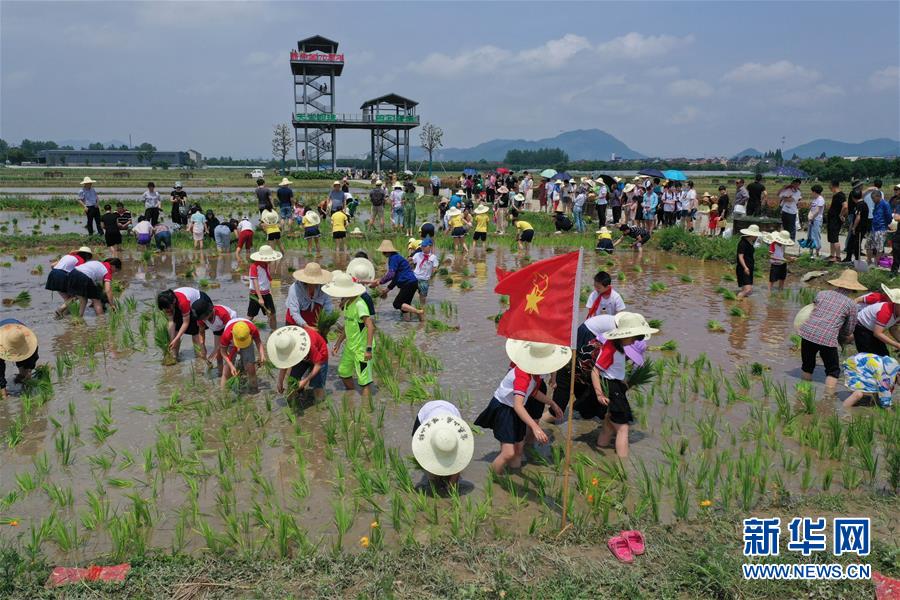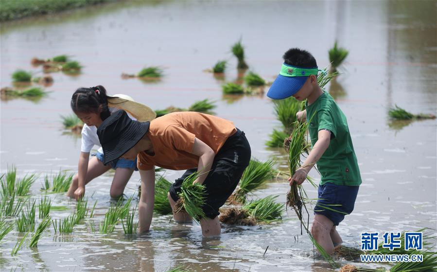 6月7日,孩子和家長在稻田里插秧。新華社記者徐昱攝